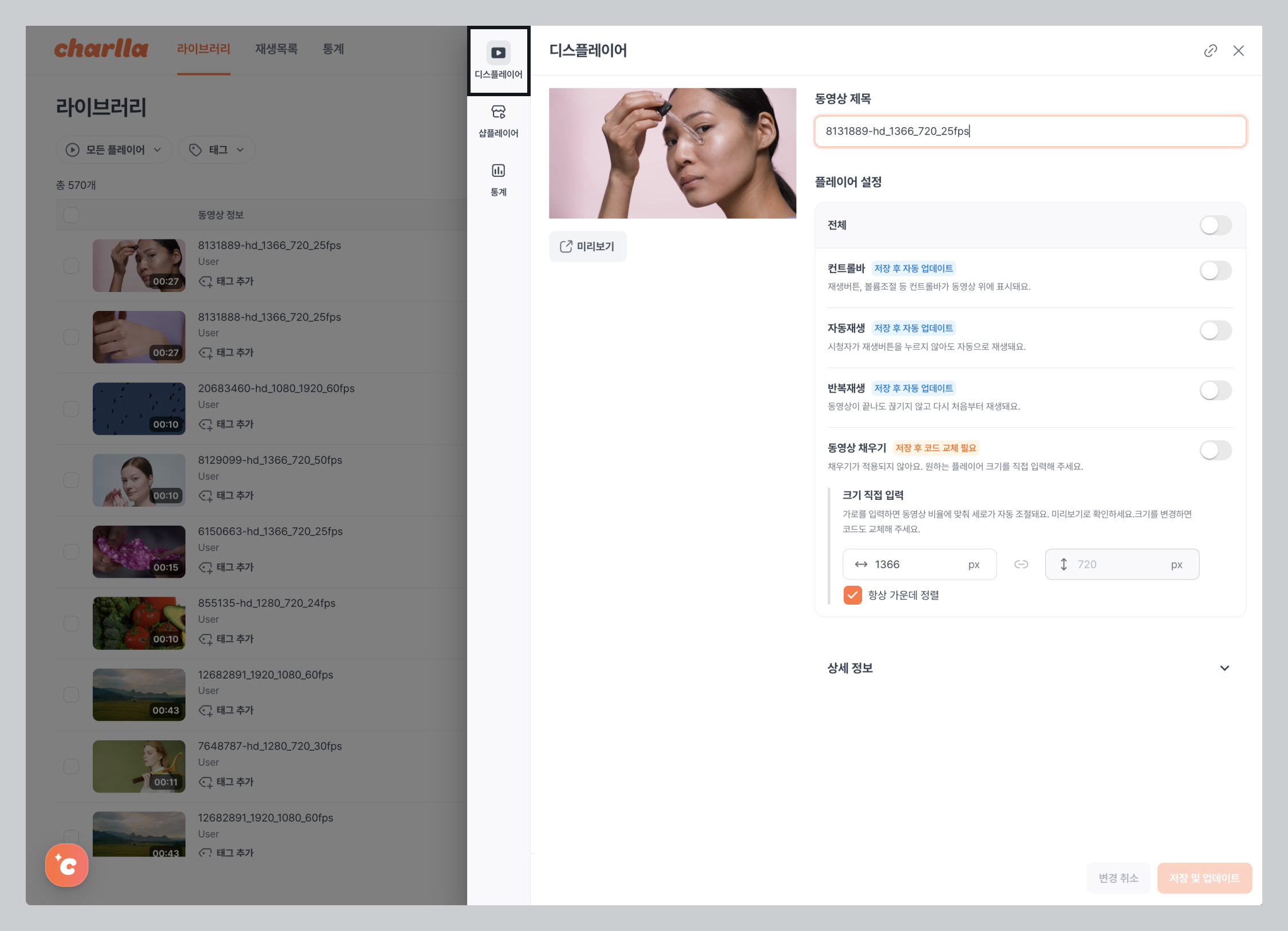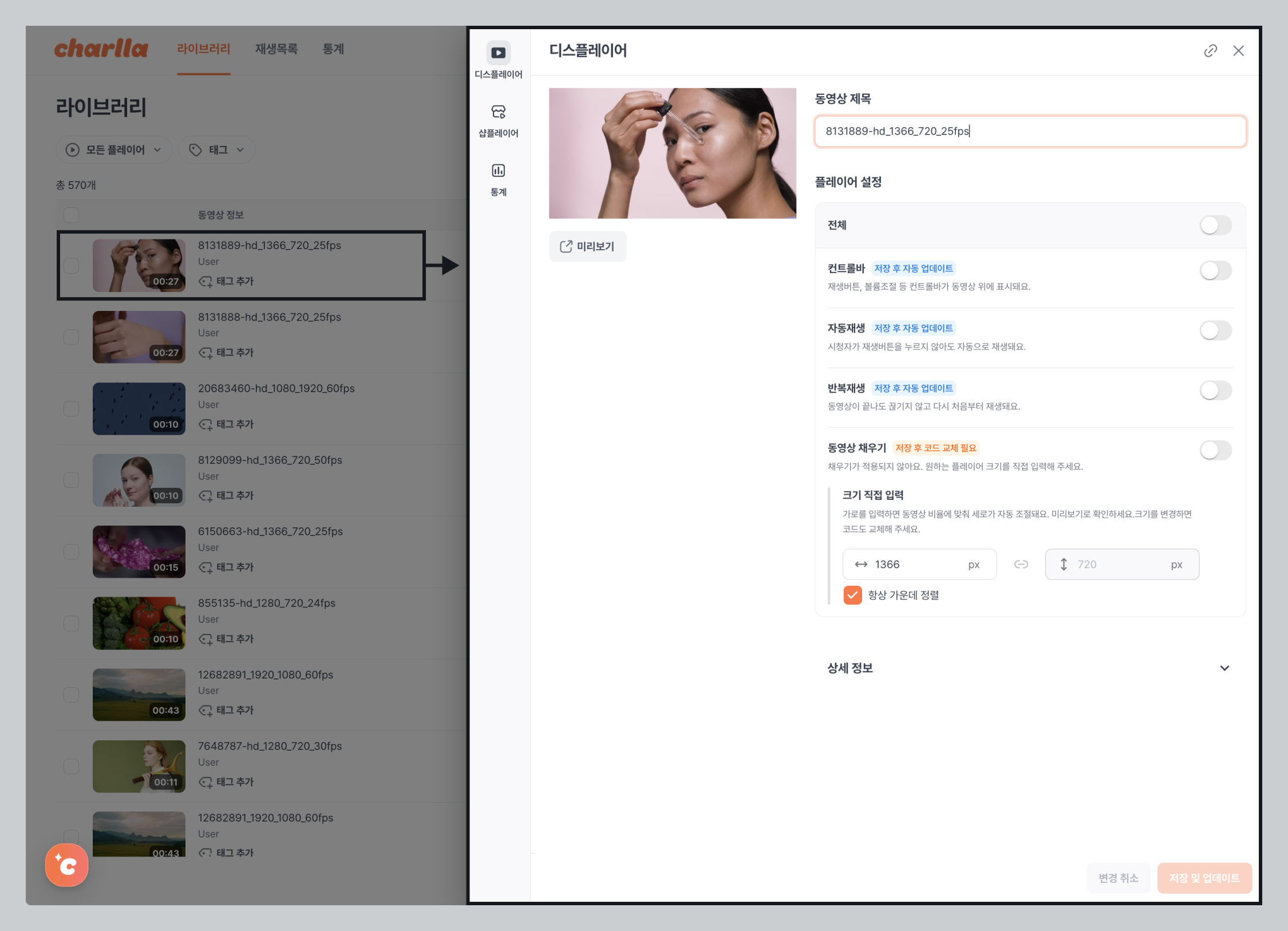* 동영상 정보 \~ 등록일 행 : \[사이드바] > \[디스플레이어 탭]이 열림