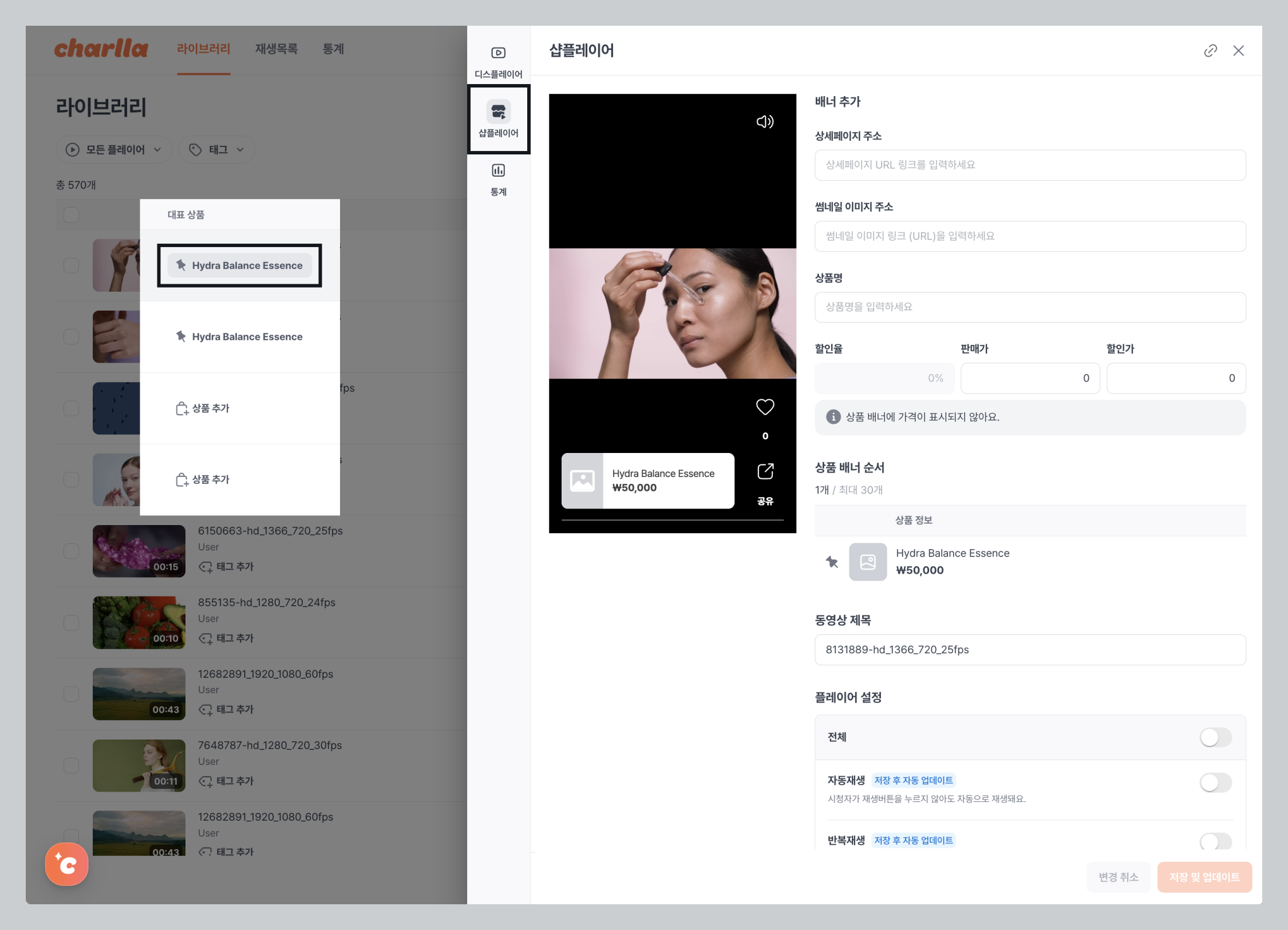 * 대표상품 행 : \[사이드바] > \[샵플레이어 탭]이 열림